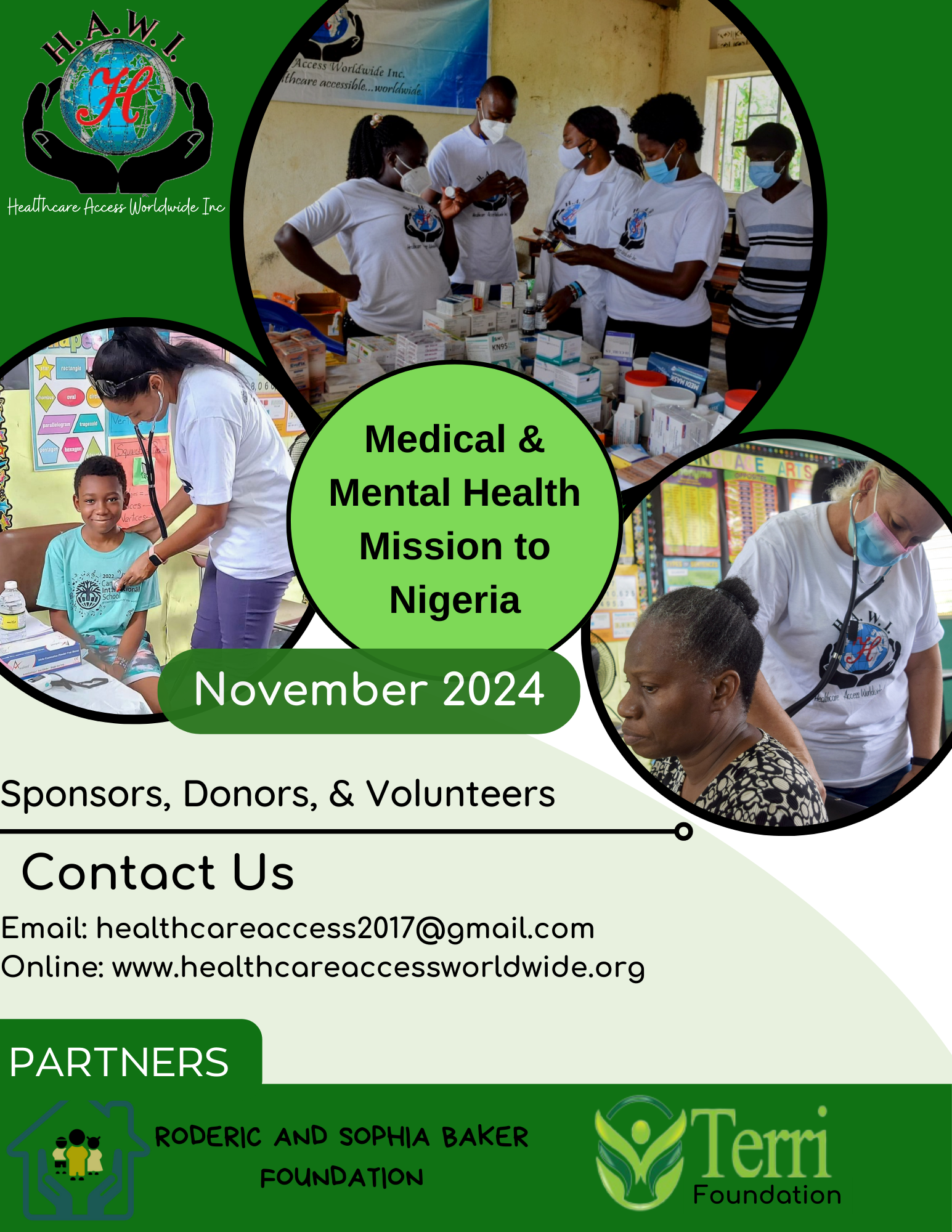 Our Next Medical Mission (5th) is planned to take place in Nigeria sometime in November! This marks HAWI’s introduction to making an impact on the lives of people in West Africa. We are incredibly excited to extend our reach and provide much-needed support to the community in Nigeria. HAWI is dedicated to joining hands with the Roderic and Sophia Baker Foundation and the Terri Foundation in a collaborative effort to bring both medical and mental health assistance to those in need in Nigeria. We believe that by working together, we can make a significant difference in the lives of individuals and families who require these essential services the most. We invite you to stay updated on our progress and learn more about our mission by connecting with us via email at healthcareaccess2017@gmail.com or visiting our website, healthcareaccessworldwide.org. You can also explore our posts and stories tab for real-time updates and firsthand accounts of our efforts. Your support and donations mean the world to us, and we look forward to sharing this transformative journey with you.